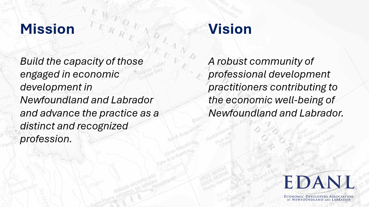 Our mandate is to: Provide training and professional development opportunities for those involved in economic development in Newfoundland and Labrador; Foster a community of practice for economic developers in Newfoundland and Labrador through the organization of events and the sharing of experience, insights, tools, and resources; and Share the stories and successes of practitioners to advocate for recognition of and investment into economic development in Newfoundland and Labrador.